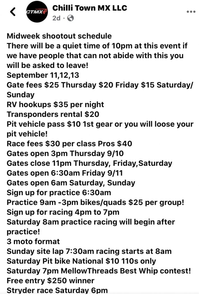 The Midwest Shootout will be held at Chillitown mx this year September 11,12,13 practice Friday and racing Saturday and Sunday with a 3 moto format! Quads will run 2 moto’s on Saturday! Gates will open Thursday afternoon at 3pm to 11pm practice will be from 9am to 3pm Friday! Saturday practice will start at 8am and racing will start after practice!