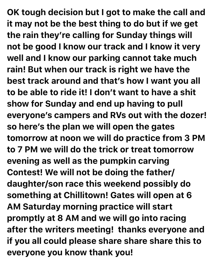We have changed our program for the weekend we will be practicing Friday from 3 PM to 7 PM and a full schedule of racing on Saturday Nothing will be going on on Sunday