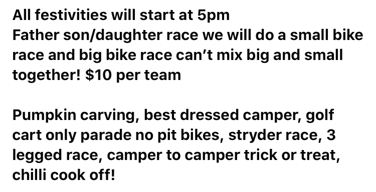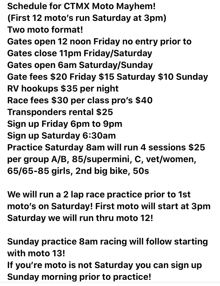 If anyone is looking for a great weekend of racing come down to CTMX For our Moto Mayhem Halloween event this coming weekend October 17 and 18th if you have any questions about the schedule please call 513-266-2866 we will be honoring OMA carts at this event since we did the race in early July as a combo series race! Here is a full schedule of how things will be ran! Hope to see everyone here!