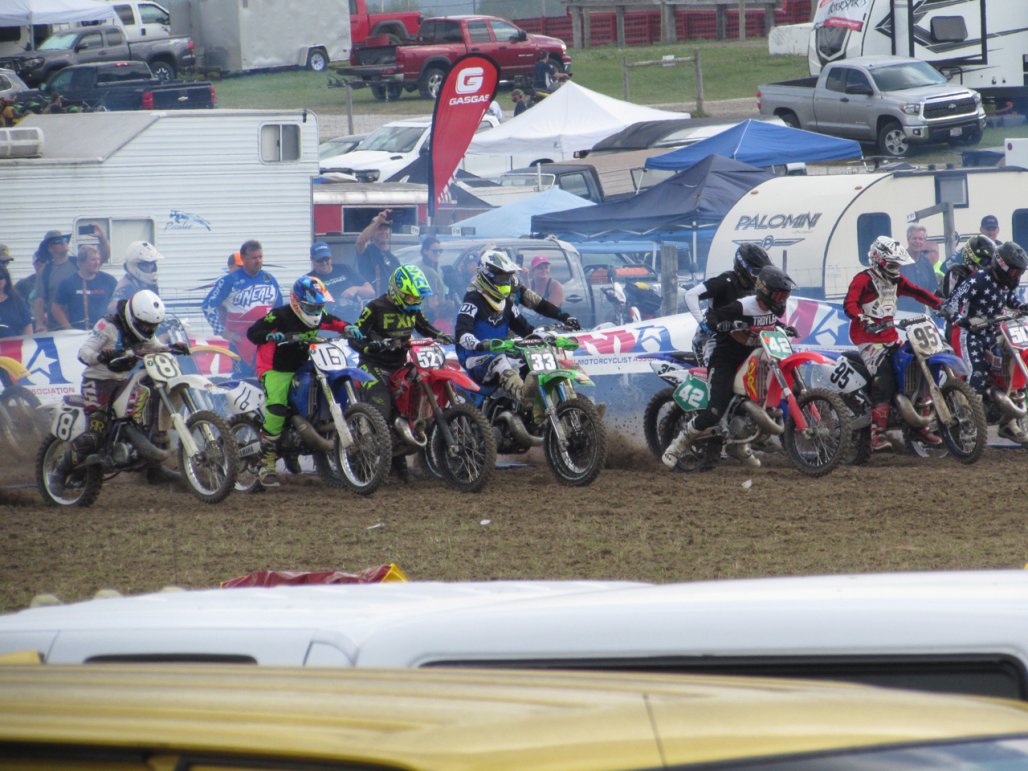 We were stewing over how many years it had been since he last raced Vintage Days, and it's been like seven years we're thinking. He struggled with the Cross Country race back then and vowed he wasn't going to line up for that again. But, once he decided to race this year, he thought he would at least have some fun trying the hare scramble again. So........ When I finally made it back to the pits with my broken bike and the horror story of the hill climb struggle, I told him he might want to change his mind and skip it. Anthony pondered it for a bit, and said "to hell with it....I came here to race"!