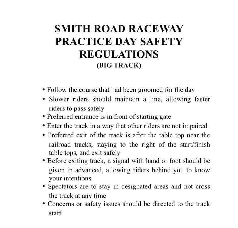 Next Practice is Wednesday May 4th from 4-dusk, bikes only. All 3 tracks will be open (Main$30, Intermediate$20 and beginner $15) Some reminders, the main track is for 85cc and above bikes only. All Practices are bikes only. Everyone should ride the track as it is groomed for the day:No Cutting the track. We are a cash only facility (no checks/debit/credit)If you bring trash in please take it with you (wrappers, fast food trash etc)