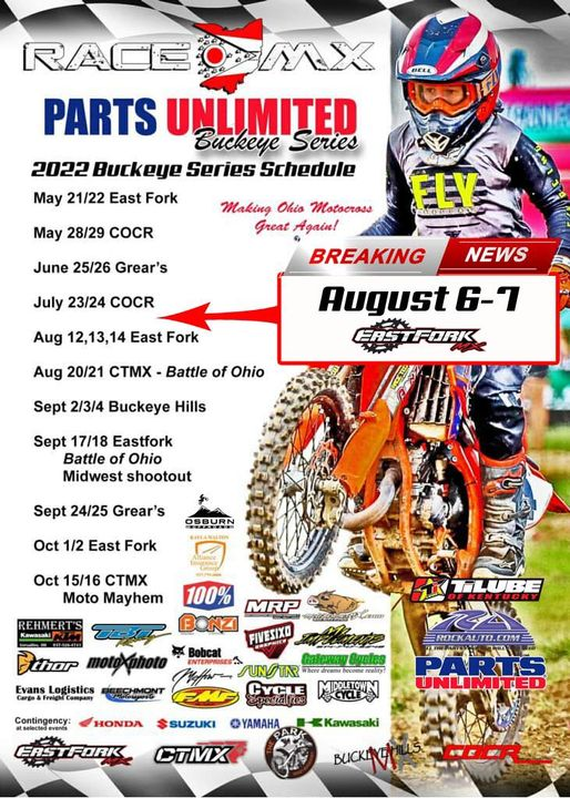 Final Race at Eastfork Mx for the season, this weekend 10/1 &10/2, If you havent made it out to race the new track, this is your last chance for the season. Scott is adding fresh dirt at the start corner and s few other places. Come out and race both days, with a gate full or riders. included on the revised schedule we have rescheduled the rained out Buckeye hills race at Chillitown on October 29th & 30th