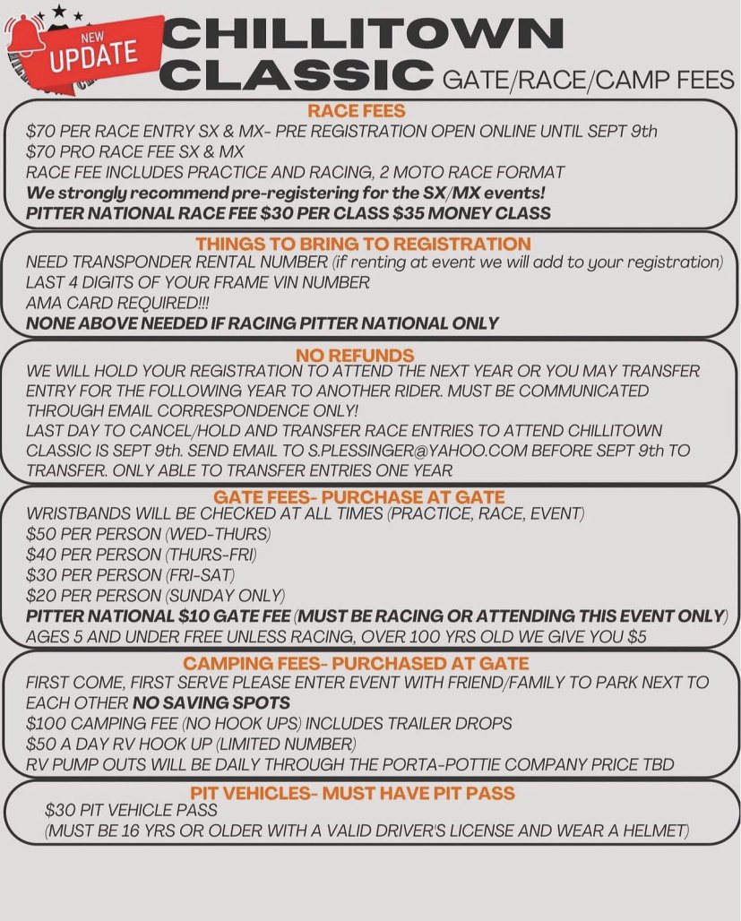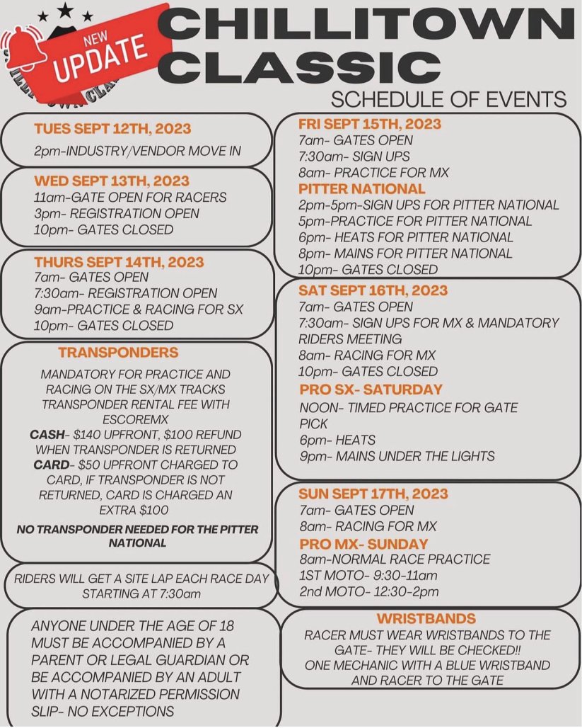 AMA Featured event September 14th -17th with supercross racing, followed by motocross racing. There will be alot of after hour activities throuhout the week. Mark your calenders for a week of racing and fun. Early signup link. https://secure.tracksideprereg.com/ctmx/index.asp?event=14&l=4&scrto=eventSelect#eventSelect
