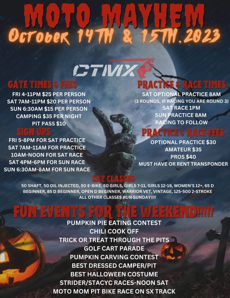 Annual Chillitown Moto Mayhem race this weekend. This is the last race of the season, come out and join us for a fun filled weekend of racing and Halloween festivities.