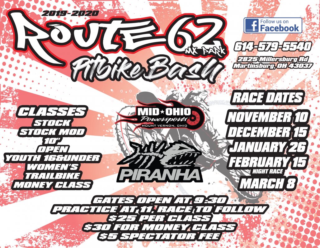Wed open for practice 4-830 sat 11-4 This Sunday the the 8th is the last pitbike bash and I have a great day planned for you guys. I will award the champion in each class (not the money class) also have a very nice lunch/dinner planned so come hungry. The OHIOMOTO show will be in-house again playing the beats/announcing, we have around 250$ in gift cards plus giveaways, after races you all will be able to free ride after for a couple hours. 50/50 raffle. There is no extra charge to eat or ride after just your normal race fee and 5$ spectator fee. I can’t thank you all enough for a great year! I may do something extra if we can BEAT 80 ENTRIES so tell everyone you know with a pitbike to come join us for a great day of pitbikin!