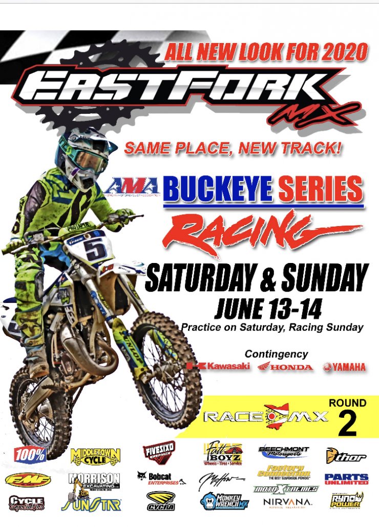 This weekend Saturday, June 13 and Sunday, June 14 will be the second round of the Race Ohio MX Buckeye series at East Fork MX! We have totally rebuilt and all new track for this year should be very exciting for everyone! Practice will be Saturday from 9 AM to 3 PM we will be having a pit bike race after practice for 50cc and 110cc two different classes! Practice for racing will start Sunday morning at 8 AM! Camping is allowed gates open a 4pm Friday