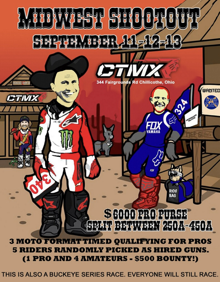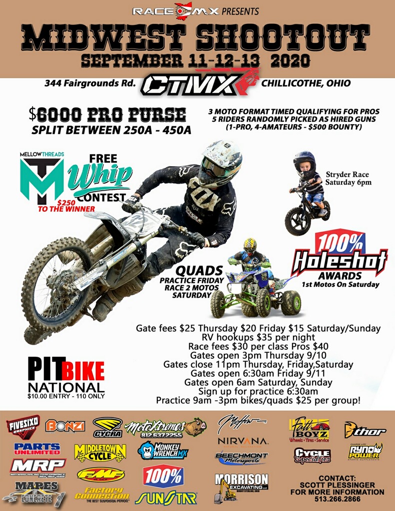 The Midwest Shootout will be held at Chillitown mx this year September 11,12,13 practice Friday and racing Saturday and Sunday with a 3 moto format! Quads will run 2 moto’s on Saturday! Gates will open Thursday afternoon at 3pm to 11pm practice will be from 9am to 3pm Friday! Saturday practice will start at 8am and racing will start after practice!