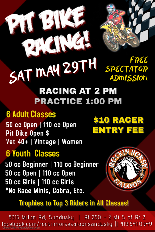 No gate fee. $10 per rider entry fee per class. Fun for all mini bikes kids, adults, women. Camping available for a fee but it includes the entertainment and dont forget NO GATE FEE.