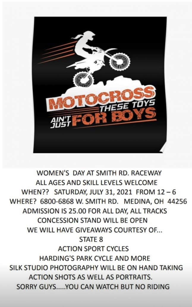 Smith Road Raceway PR Addict Jul 7, 2021 #1 One of our riders approached us and asked if we would host an event for her women’s riding group so we are going to be doing a ladies practice Saturday all the details are on the flyer below Attachments AF3C7F70-B824-45B4-A2C2-99838030F0B6.jpeg 99.1 KB · Views: 132