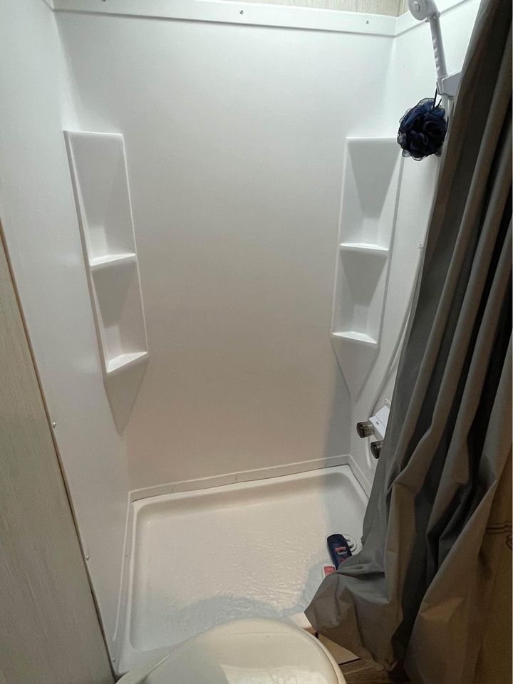 Features patio deck with gates, power tongue jack, power stabilizer jacks. TV and $350 storage cover Included with sale. Added manual battery disconnect switch and winterization kit for easier winterization.