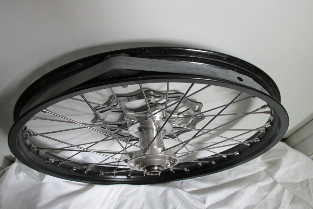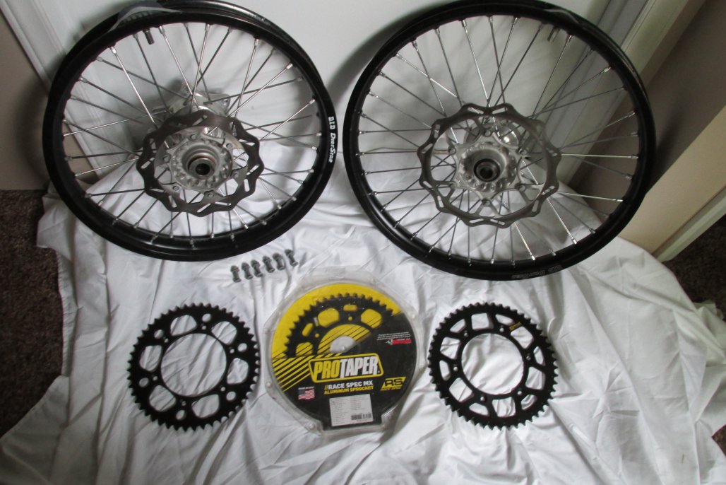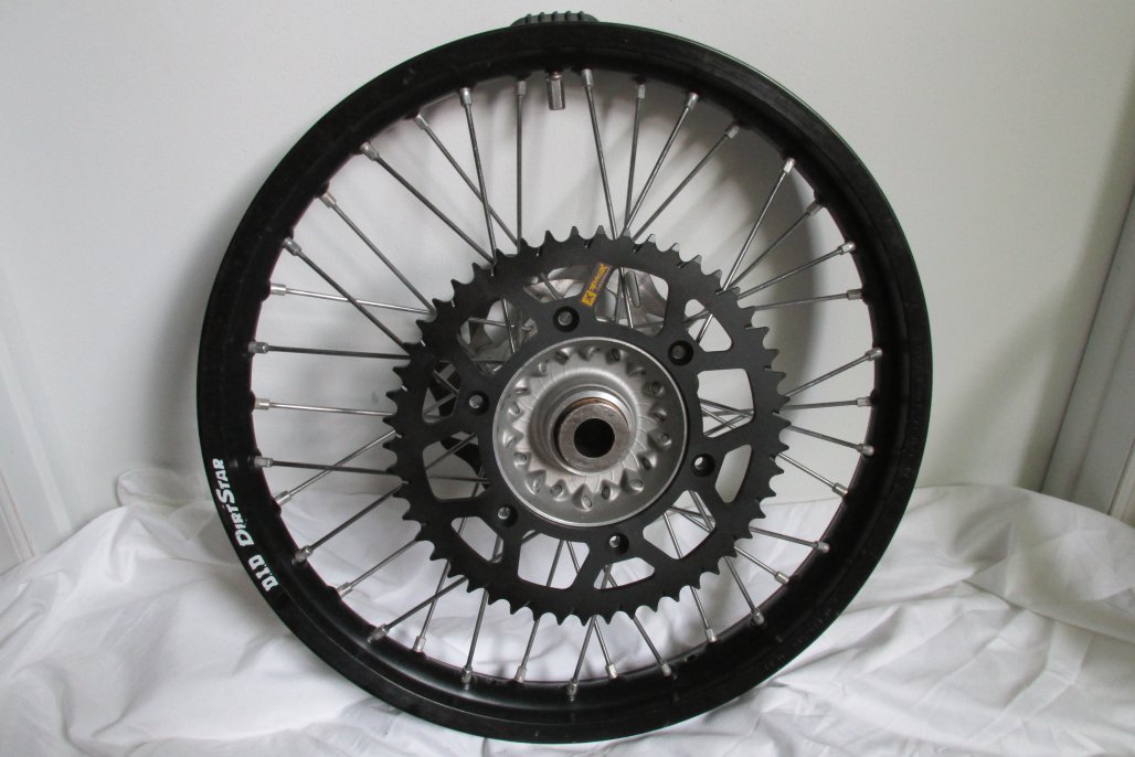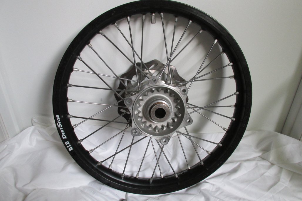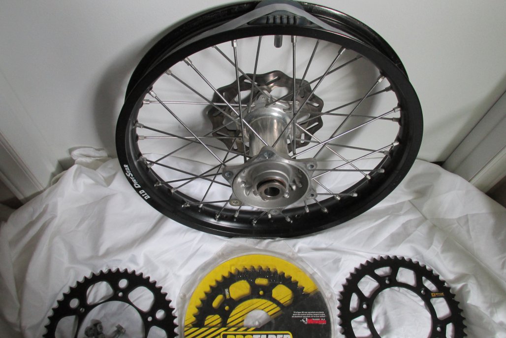 In real Good Condition, no dents on either. 19" rear comes with 3 new rear sprockets 48,49 and a 50 tooth. 21" front is Like New and both come with straight rotors too. Both come with spacer and rim locks also.