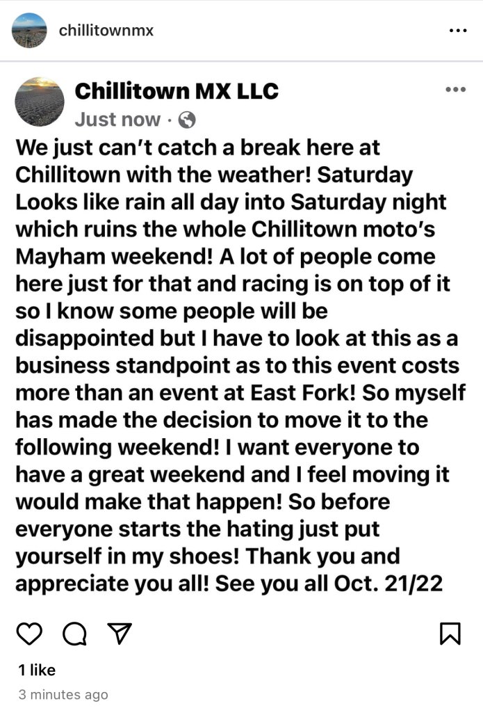 Annual Chillitown Moto Mayhem race this weekend. This is the last race of the season, come out and join us for a fun filled weekend of racing and Halloween festivities.