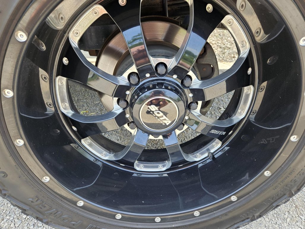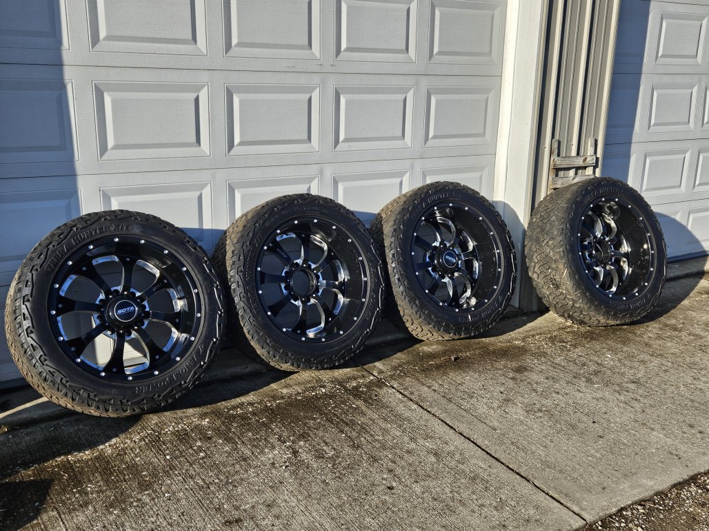 They are 35x12.5-22 Venom Terra Hunter tires with 22x10.5 Sota Novakane wheels. Tires are decent, wheels are starting to lose some of the finish. I'm missing 2 center caps (price reflects this).