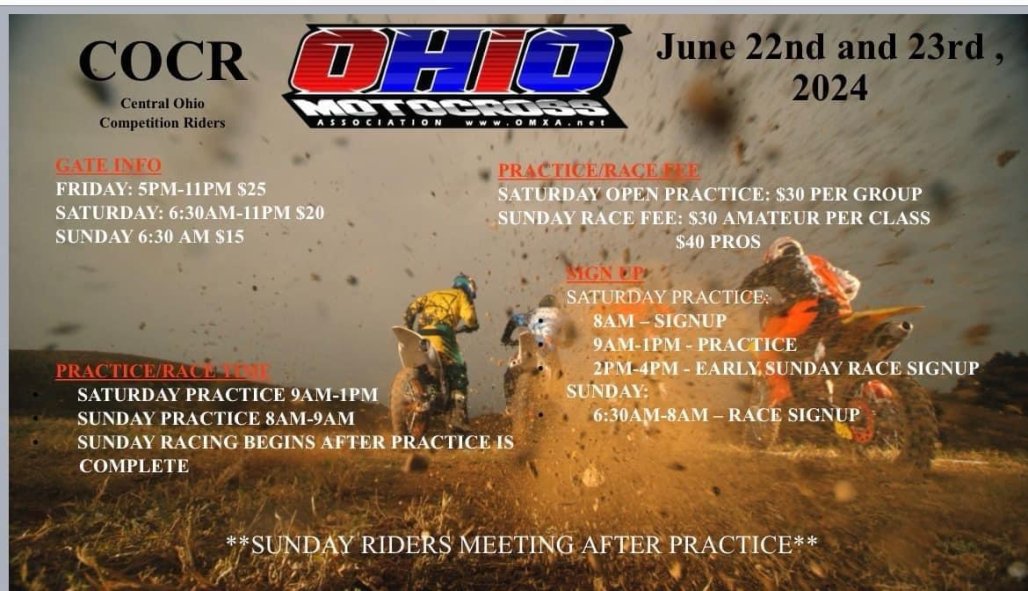 COCR is excited and grateful to host an OMA event this year. Please come help support one of Ohio's longest standing MX facilities. Practice and racing Saturday, and racing on Sunday. If you can swing it drive your PU truck or van. We've got limited parking/camping space, and it will most likely be a large turnout. Otherwise, get there early, and please park like it makes sense to get the most people in. Your fellow racers will appreciate it.