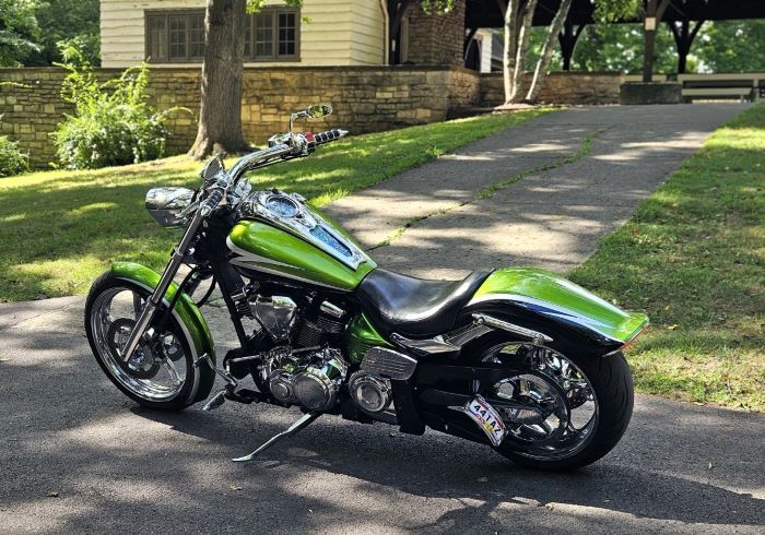 Freedom Performance Sharp Curve Pipes, Power Commander III USB Fuel Controller, Yamaha quick detach backrest (with lock), Professionally dyno tuned by Twin Cam Performance, Raw Design Front Stealth Turn Signals, Blaster X Integrated Tail Light, Kuryakyn Warrior Style Side Mount License Plate, Webslingers Custom Speedo and Dash Plates, 5" Foot Control Extensions, Kuryakyn ISO grips with spike ends, Scythe style mirrors, Removed rear brake disc cooler, Chrome rims, Avon 240 rear tire, Barons Slam kit with progressive spring, L&M Full Wrap front fender, Chrome Alternator Cover, Chrome Kuryakyn Levers, Chrome master cylinder covers, Custom Paint, Spike Air Cleaner, Chrome Pulley, L&M Seat, Chrome Axle Covers, Kury Stiletto front pegs, Cobra passenger floorboards, 3" spiked fork extensions, Star chrome caliper covers, Chrome switch housings, LA Choppers Handlebars, Victory headlight with Chilly's bracket.