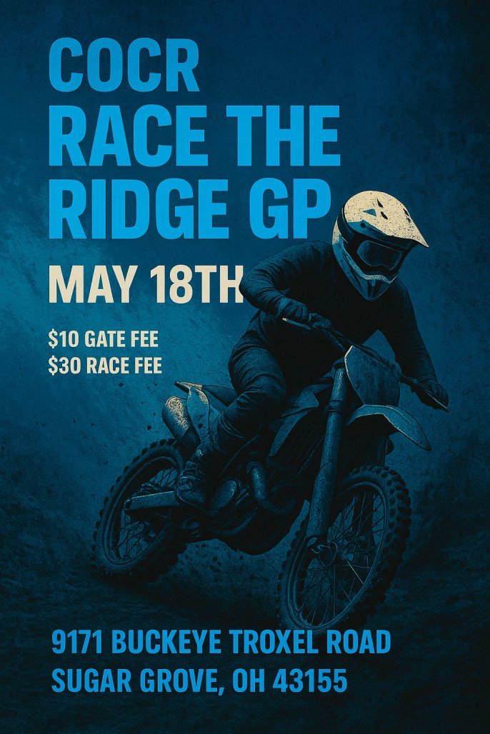 Join us May 18th at COCR for our first 2025 GP race! The course consists of a mix of woods, fields, and a portion of our motocross track. You won’t want to miss our season opener!