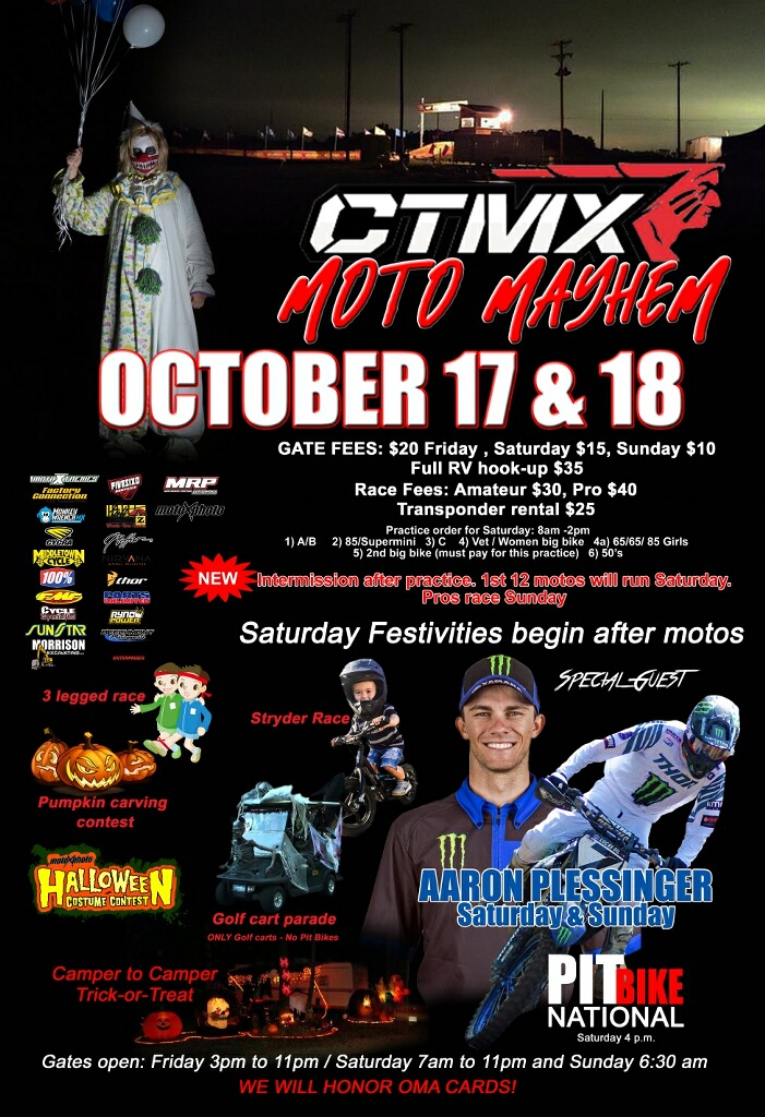 If anyone is looking for a great weekend of racing come down to CTMX For our Moto Mayhem Halloween event this coming weekend October 17 and 18th if you have any questions about the schedule please call 513-266-2866 we will be honoring OMA carts at this event since we did the race in early July as a combo series race! Here is a full schedule of how things will be ran! Hope to see everyone here!