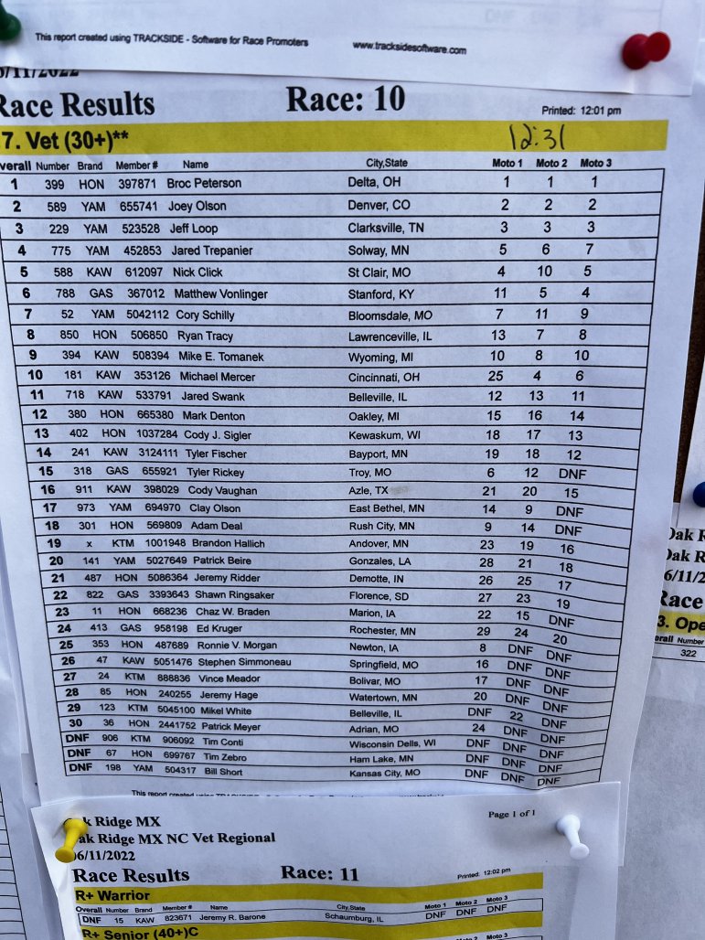 30+ was 25-4-6 (last moto might be different cause there was a protest going on when i left) for 10th. First moto went into first turn with the holeshot and got drilled from the inside wide open. Same s**t bike was mangled, and this one did in my ribs. I tried to ride up through but front end was twisted so bad not much i could do.