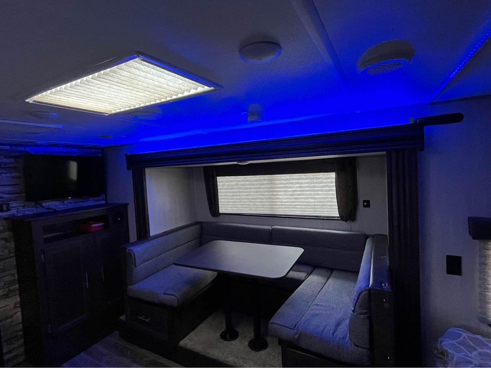 Features patio deck with gates, power tongue jack, power stabilizer jacks. TV and $350 storage cover Included with sale. Added manual battery disconnect switch and winterization kit for easier winterization.