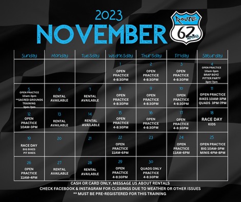 route62mxpark PR Member Nov 7, 2023 #1 Indoor practice Wed 4-830 Thursday 4-8:30 Friday 4-830 Saturday 10-3 all size bikes 3-7 is all size quads. Sunday is 10-3 all size bikes. Attachments C160E038-5AEB-409E-A061-E2C40EFF3C18.jpeg 61.8 KB · Views: 214