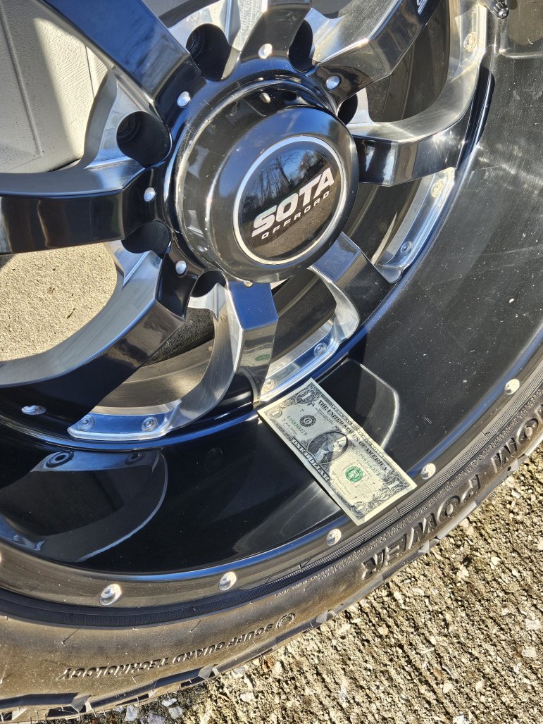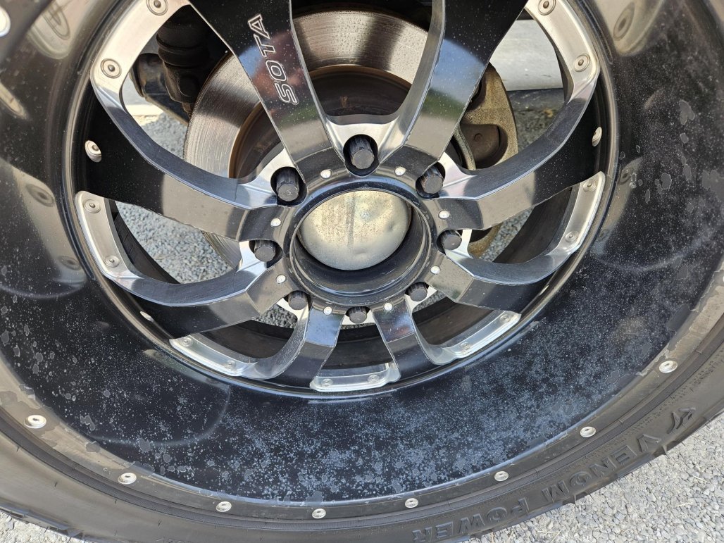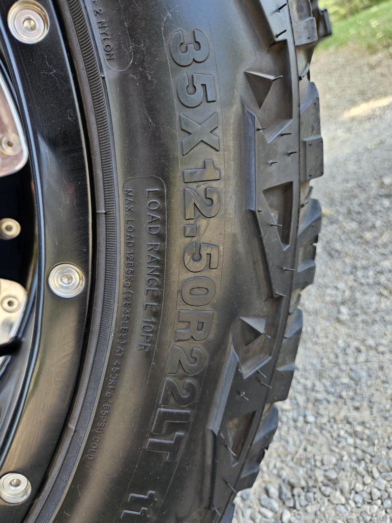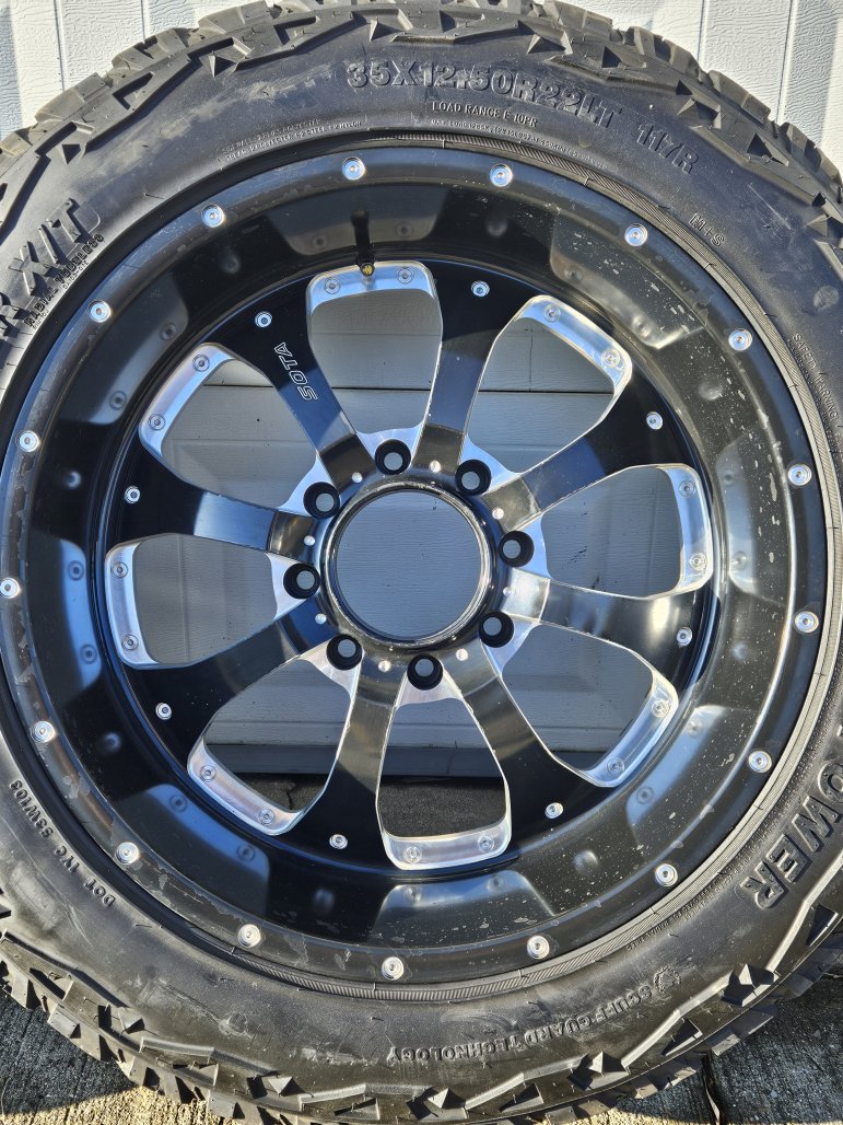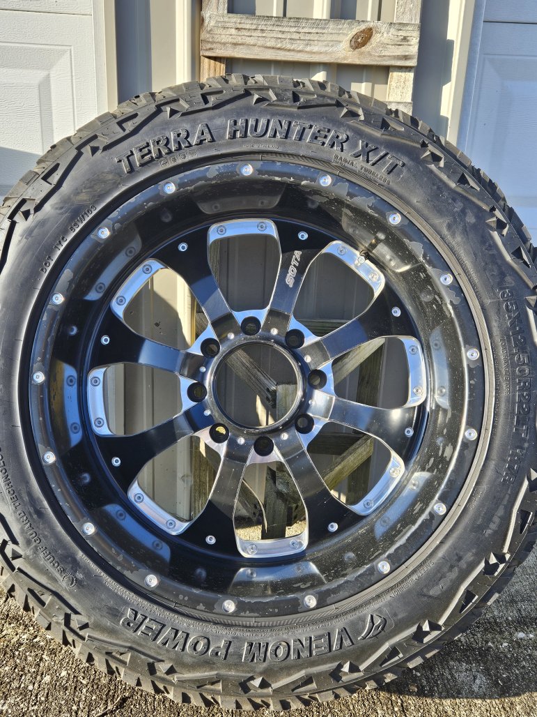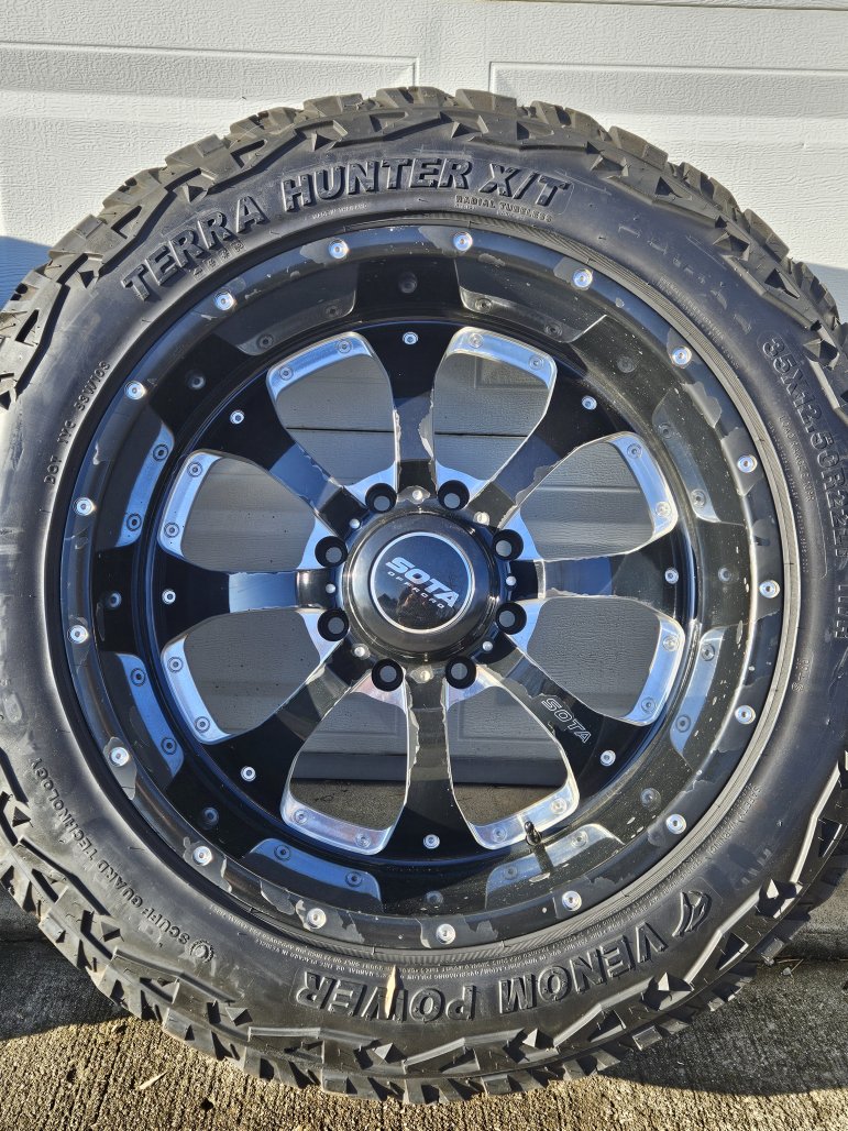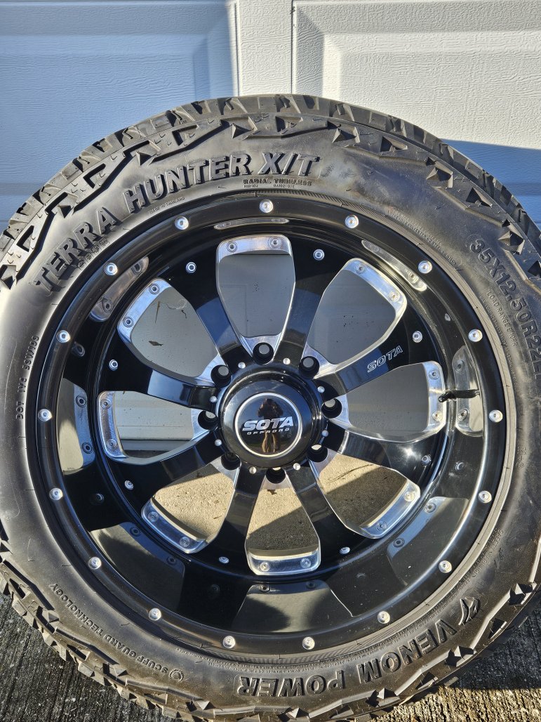 They are 35x12.5-22 Venom Terra Hunter tires with 22x10.5 Sota Novakane wheels. Tires are decent, wheels are starting to lose some of the finish. I'm missing 2 center caps (price reflects this).