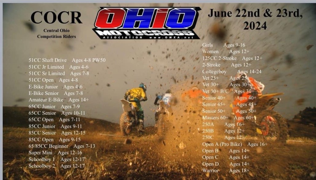 COCR is excited and grateful to host an OMA event this year. Please come help support one of Ohio's longest standing MX facilities. Practice and racing Saturday, and racing on Sunday. If you can swing it drive your PU truck or van. We've got limited parking/camping space, and it will most likely be a large turnout. Otherwise, get there early, and please park like it makes sense to get the most people in. Your fellow racers will appreciate it.